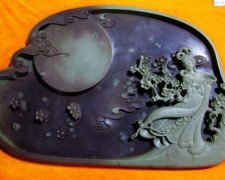 辽砚,产于本澳市桥头镇。以当地特产的青紫云石精雕而成。青紫云石是一种沉积岩,当地人称之为线石。以其紫色石中间有一线青色石而得名。其石色泽明亮,纯净无瑕,紫若沉被,...