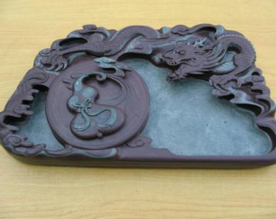 2.辽砚采用青紫云石,质地细腻、坚硬、凉润,制成砚台,有“滑不流墨、涩不磨笔,的特点。据说,在辽砚上研成的墨汁,用砚盒盖严,可放里一月不干。据北京荣宝斋行家的看法:辽砚和端现相比,辽砚石质的“硬”和“凉”,都还差一点,但刀工和造型,却毫不进色,不失为砚中佳品。