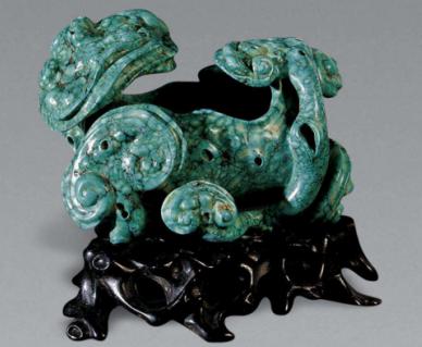 3.与绿松石雕相似,安绿石雕首推仿古器物,因安绿石的深墨绿的斑驳杂色最宜仿青铜器。所雕刻的炉、鼎、熏、瓶、战车等,造型古朴稳重,图案遒劲多姿,刀法犀利爽朗,每种题材内容与形式高度统一,为仿古器物的佳品。